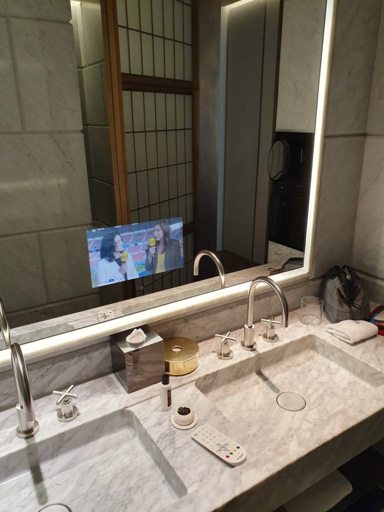 Our host takes me to our room and gives a run-down of the features and functions. The bathroom is bigger than our previous hotel room! There’s welcome chocolate strawberries in the bar and a bottle of Veuve Clicquot on ice in the living room. A Bang & Olufsen TV, automatic curtains, a giant bed, and robes hanging in the wardrobe. The bathroom has a rain shower, heated panels behind the towel rails, generous toiletries, and an in-mirror TV (of course).