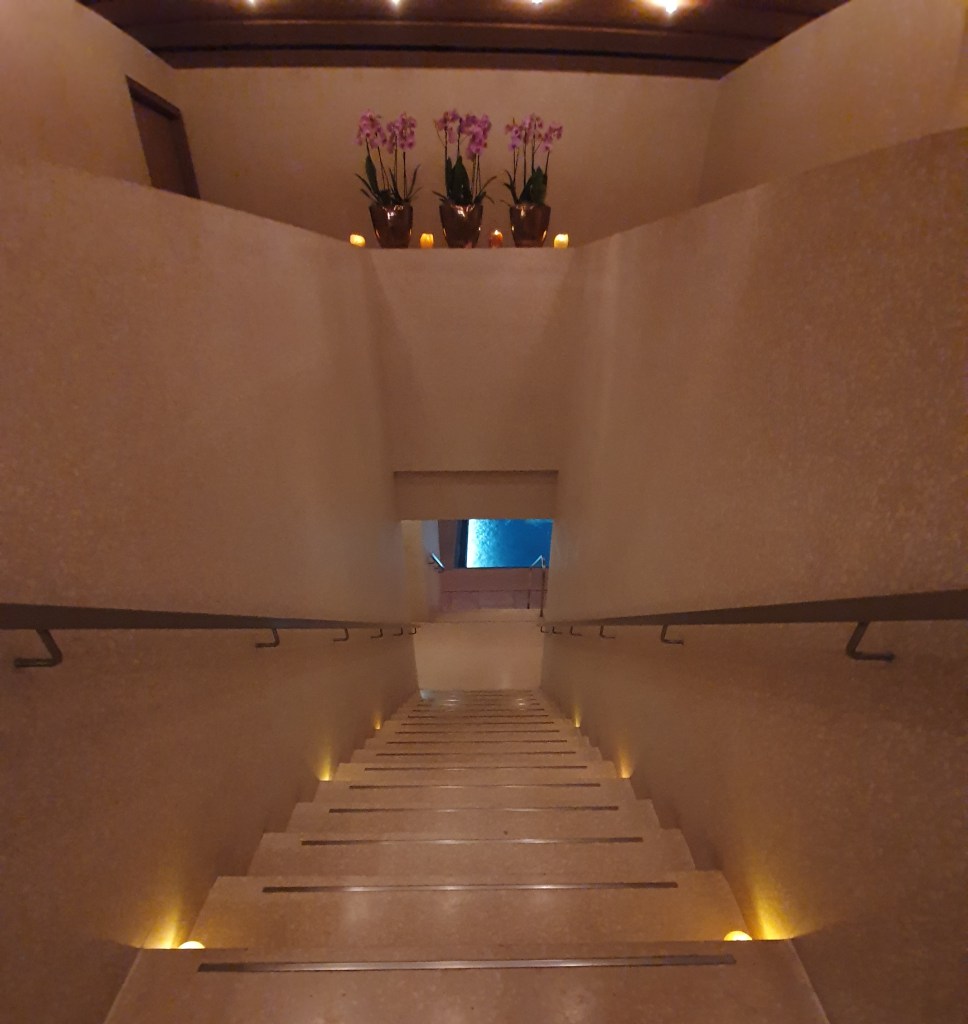 The spa facilities are in a cavernous underground space – gym, lap pool, jacuzzi, dry sauna, and hammam (steam sauna). Bathrooms are generously appointed with complimentary toiletries, slippers and robes. Our massages are delivered by a skilful therapist and by the time our room is ready we float out of the spa in a state of sheer bliss.