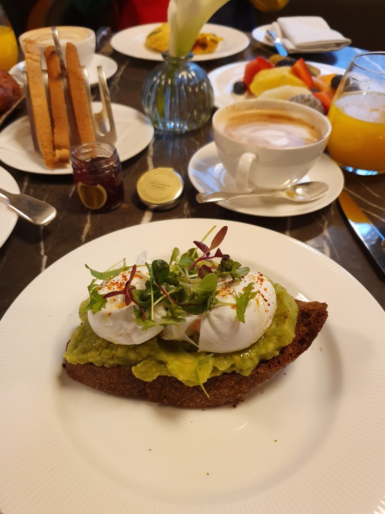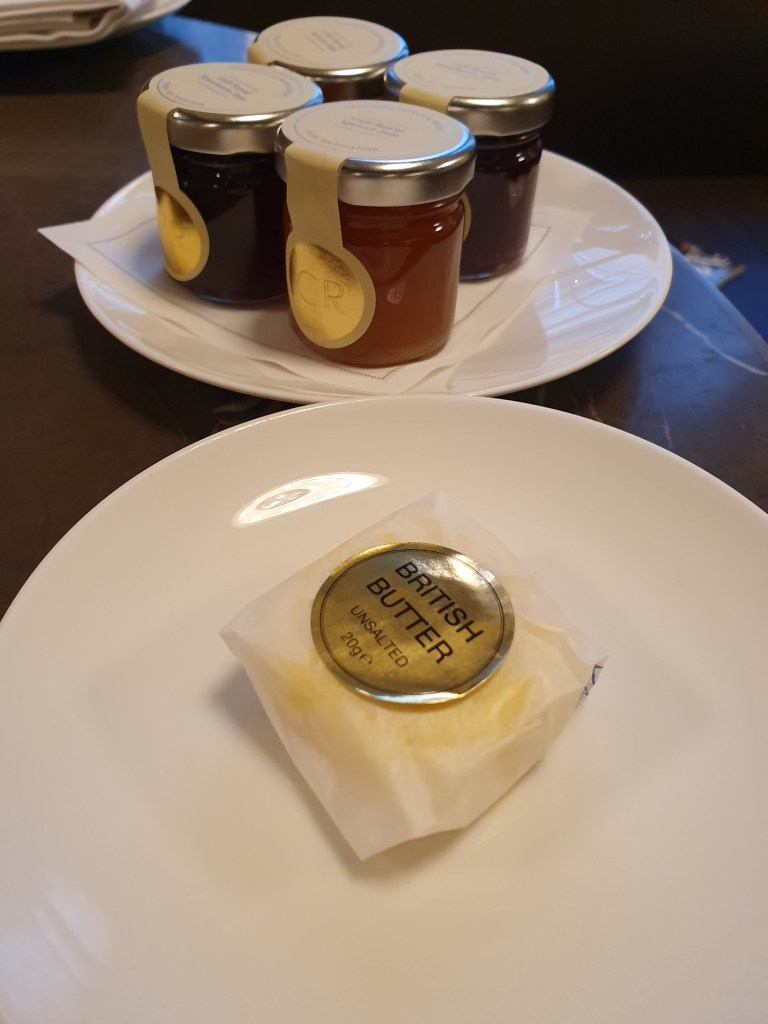 Next morning we enjoy our generous included-in-the-package breakfast – A la carte menu plus pastries and spreads. I can only assume that the little jars of jam and honey are also complimentary, because they travelled home with me.