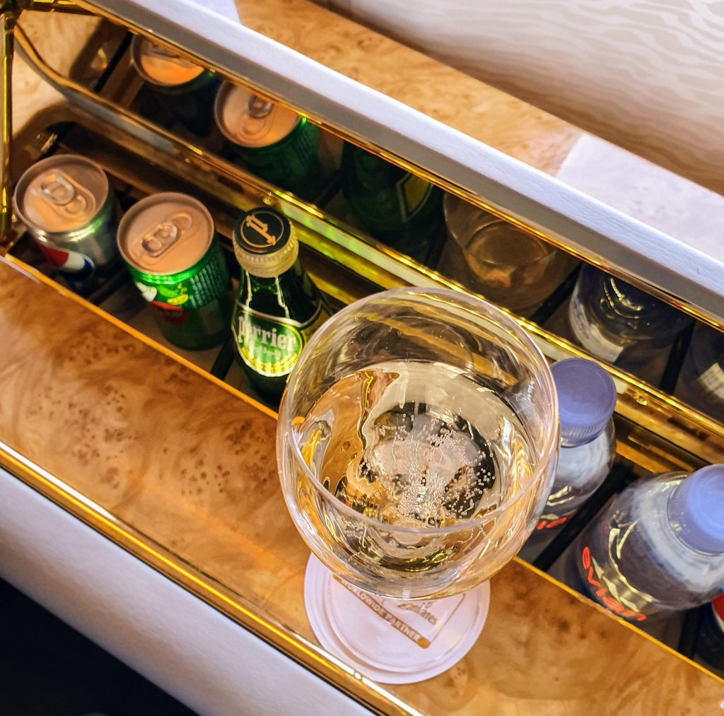 I’m still exploring the loot when the pre-take-off Moet is served and the crew explain some of the seat and suite functions. Once in the air and we have levelled off, the Dom Perignon is served. Don’t mind if I do!