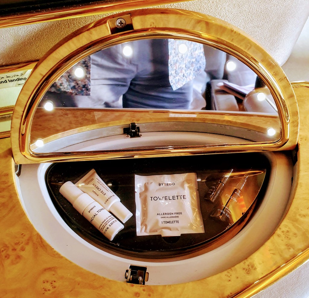 The welcome is gracious as we are introduced to our cabin crew and directed to our suites. There are 6 first class suites on this Emirates 777-300 and on this flight we are the only two passengers! The crew tell us we are welcome to use any suite we like, even to eat in one suite and sleep in another.