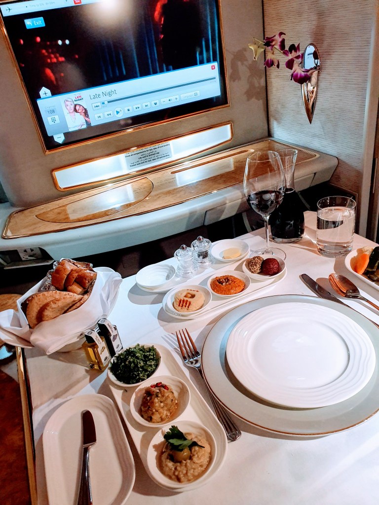 The greatest luxury when flying is space, and the Emirates first class product gives you plenty of it. But they also deliver many more surprises to keep the wow factor going. My suite is furnished with a personal mini-bar and generous snacks, I have a wardrobe, a privacy screen for sleep time, and a huge entertainment screen and noise cancelling Bowers and Wilkins headphones.