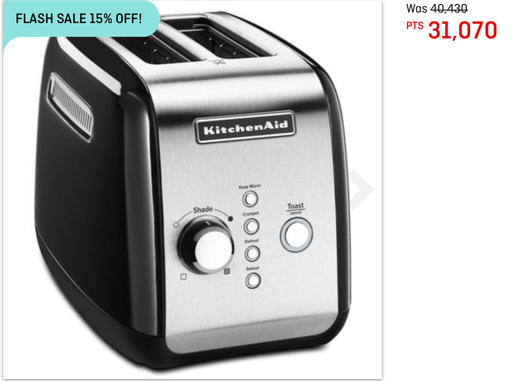 Lets start in the Qantas Store. You could buy the proverbial toaster with your hard-earned points. You’ll be down 31,070 points for a toaster that retails at around $149. That’s a miserable redemption value of 0.48 cents. Great value for Qantas, not such a great deal for you.
