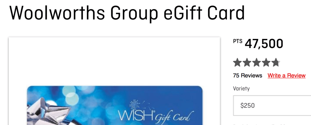 So let’s say we purchase Woolworths vouchers with our points. Seems like a sensible thing to do. The best value you can get here is a $250 voucher for 47,500 points. That’s a redemption value of 0.52 cents per point.